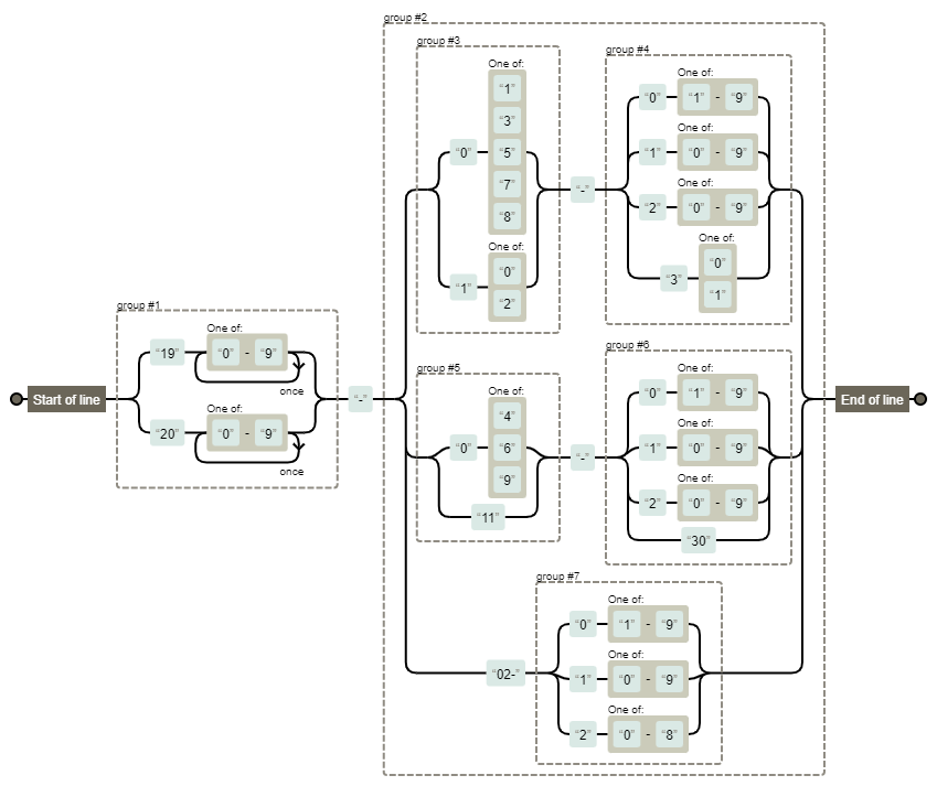regex = "^(19[0-9]{2}|20[0-9]{2})-((0[13578]|1[02])-(0[1-9]|1[0-9]|2[0-9]|3[01])|(0[469]|11)-(0[1-9]|1[0-9]|2[0-9]|30)|02-(0[1-9]|1[0-9]|2[0-8]))$";
