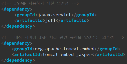 <!-- 내장 서버에 JSP 처리 관련 규칙을 알려주는 의존성 -->