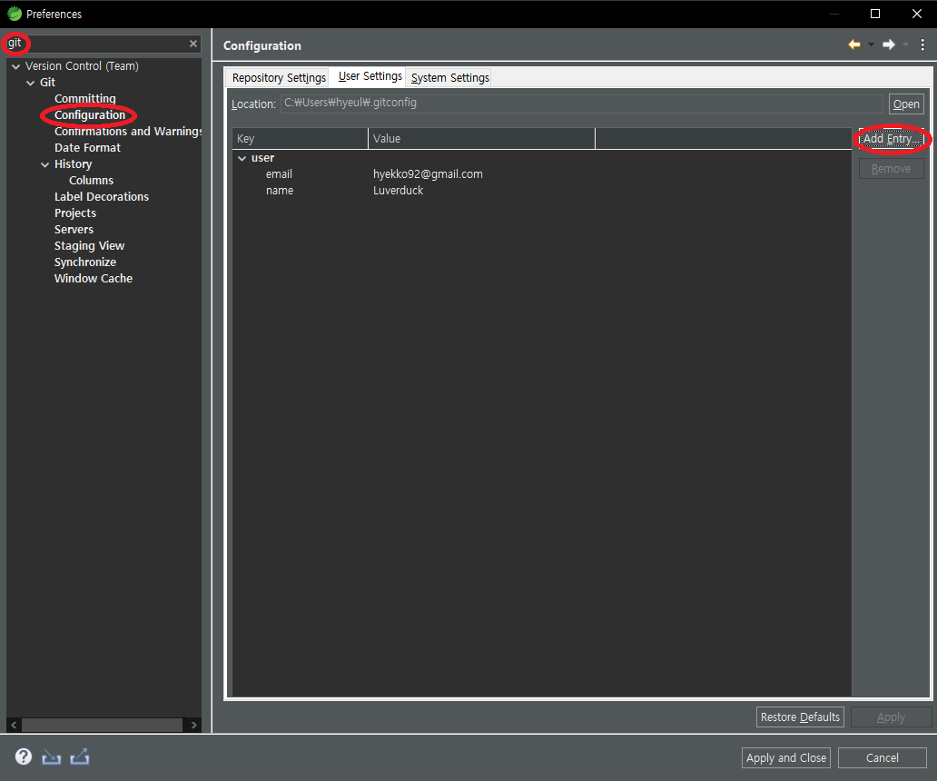 git 검색 - Version Control(Team) - Git - Configuration - Add Entry 선택 후 GitHub 이메일과 닉네임 설정