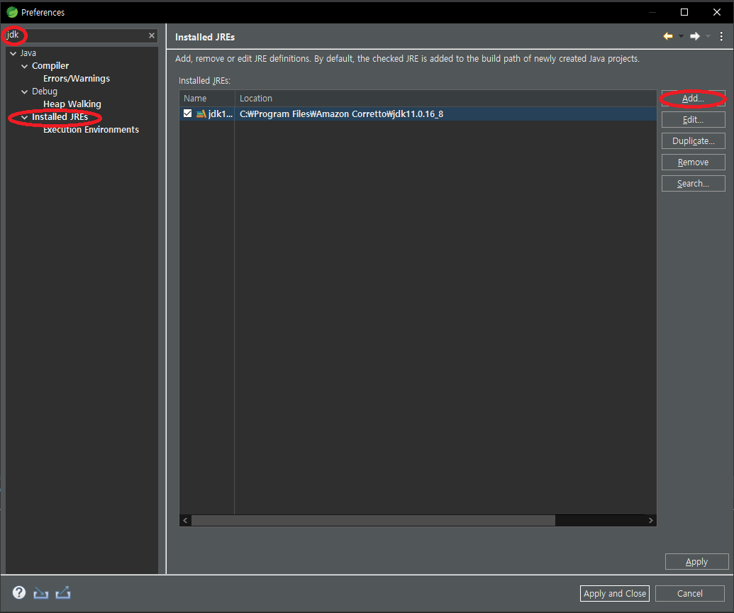 jdk 검색 - Installed JREs - Add 선택 - JDK가 설치된 경로를 추가