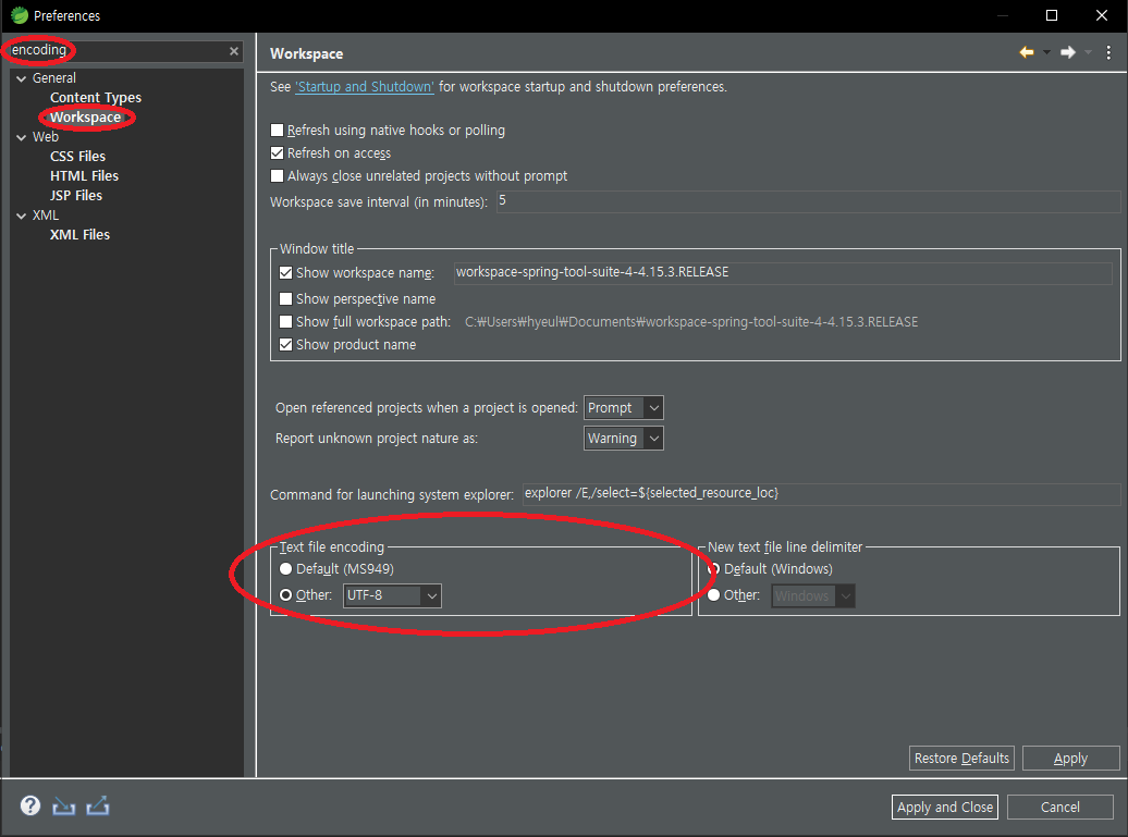 encoding 검색 - General - Workspace - Text file encoding에서 UTF-8로 변경