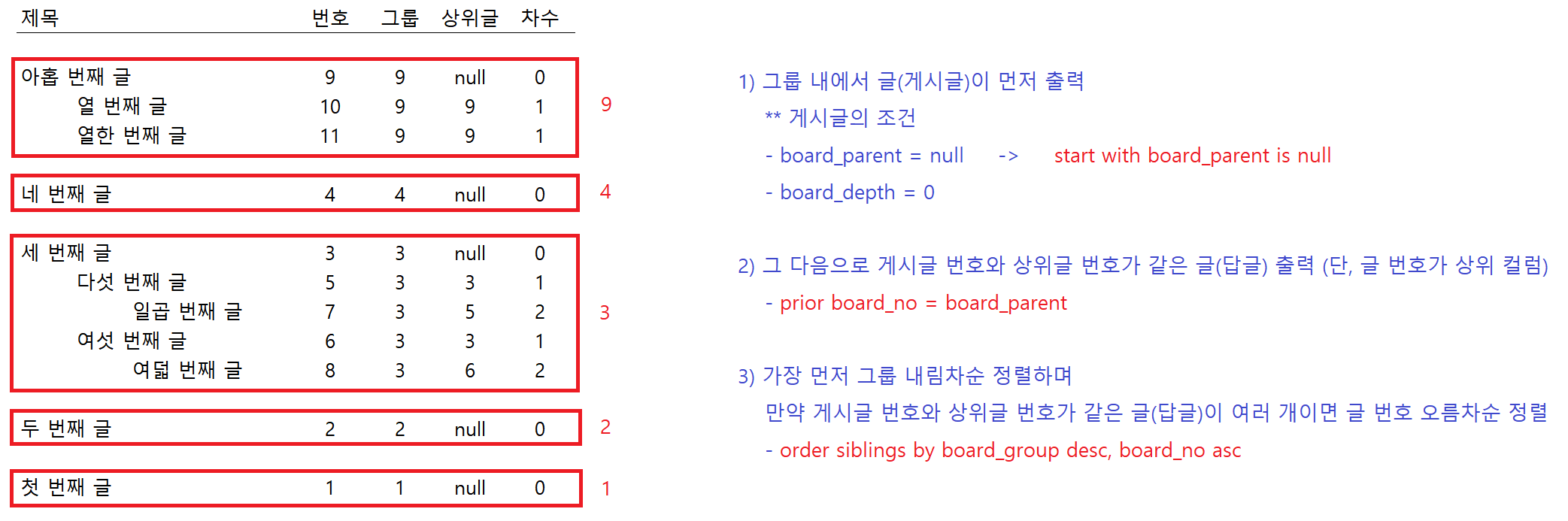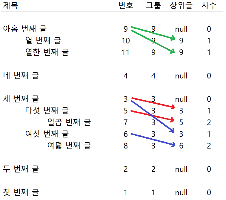 -- 여기서 글 번호(board_no)가 상위글 번호(board_parent)보다 상위 열이다