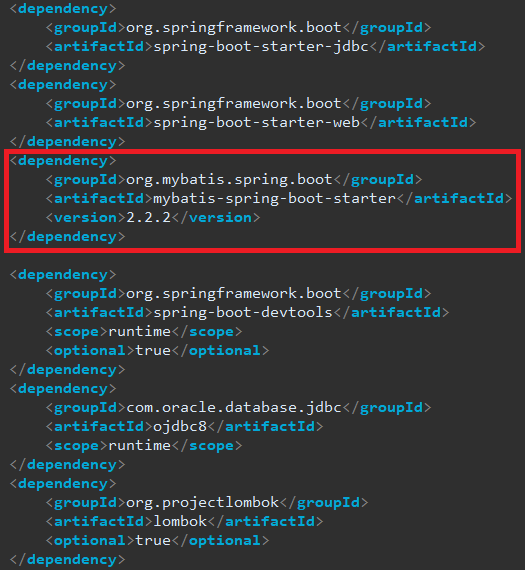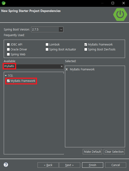 - 프로젝트 생성시 기존 의존성 외에 MyBatis Framework 추가