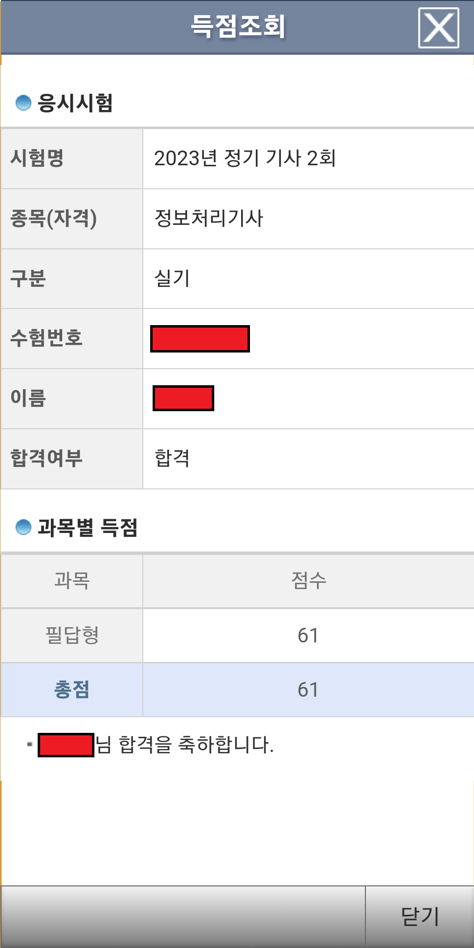 시험날 CBT 시험장에서 모든 답안을 선택한 후 제출을 눌렀더니 그 자리에서 바로 합/불을 알 수 있었다.