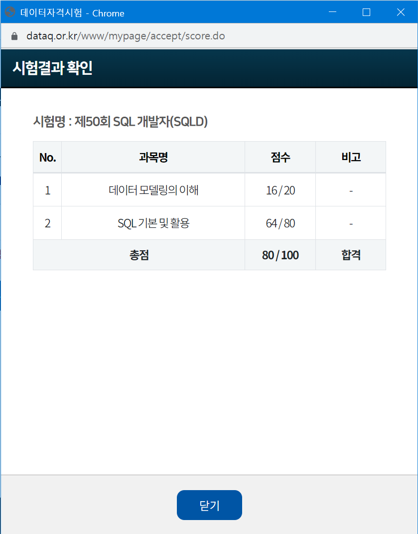 필기와 실기를 모두 합격해야 하는 정보처리기사와 다르게 SQLD는 필기만 합격하면 바로 자격증을 취득할 수 있다.