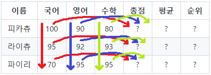 - 위에서 아래 방향으로 진행하면서 특정 회차에 데이터를 특정 행의 총점칸에 '+='하여 총점을 구한다