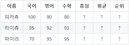 총점과 평균과 순위는 최초 0으로 설정한 뒤 계산을 통해서 채운 뒤 출력하려고 합니다