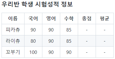 - 총점이나 평균은 출력 메소드에서 일시적으로 만들어서 출력하는 것이 좋다