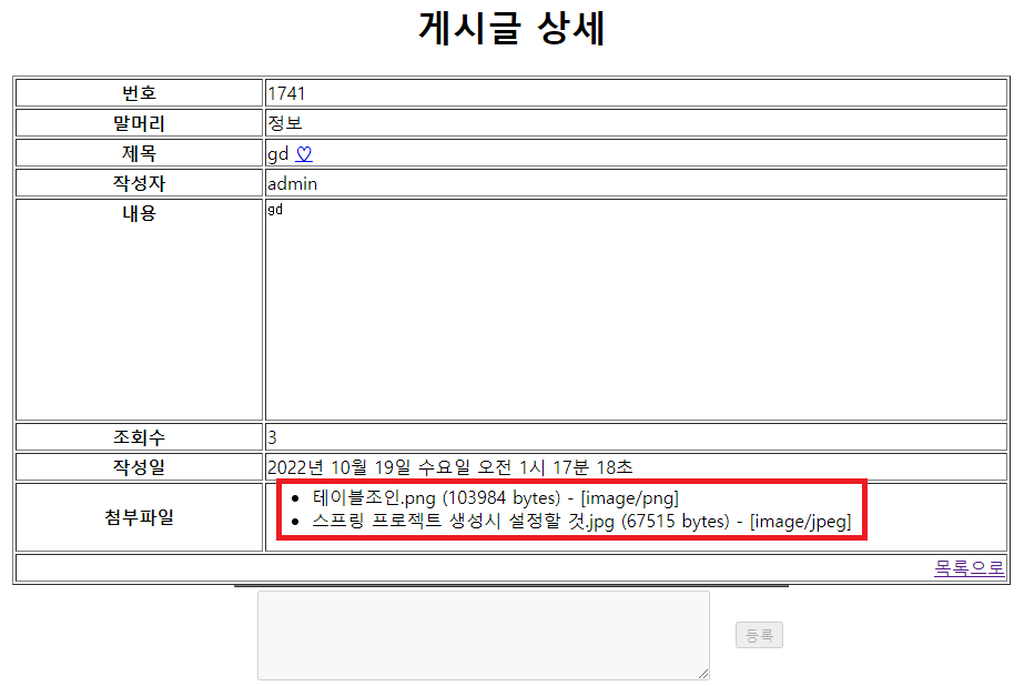 2) 첨부파일 테이블(attachment)에 해당 게시글의 첨부파일 정보 등록
